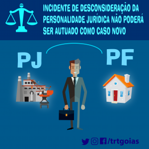 A Corregedoria Regional e a Secretaria-Geral Judiciária do TRT 18 orientam os advogados para, doravante, e até que o sistema PJe habilite documento específico para tal finalidade, protocolarem os requerimentos de desconsideração da personalidade jurídica como petição destinada aos autos da ação principal, utilizando-se o tipo de documento “MANIFESTAÇÃO” e, no campo editável, fazer constar “INCIDENTE DE DESCONSIDERAÇÃO DA PERSONALIDADE JURÍDICA – IDPJ.