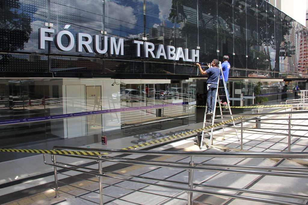 Quem chegou para trabalhar ontem, 23/4, no Fórum Trabalhista de Goiânia se deparou com uma novidade: a entrada na rua T-51 está agora sinalizada com um grande letreiro em aço galvanizado. A novidade faz parte da segunda etapa de atualização e complementação da sinalização predial do Tribunal. Além do letreiro, foram instaladas a identificação do auditório do Fórum, placas indicativas em frente aos elevadores do edifício Ialba-Luza e totens em frente às entradas das rampas localizadas do Fórum.