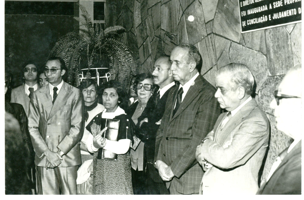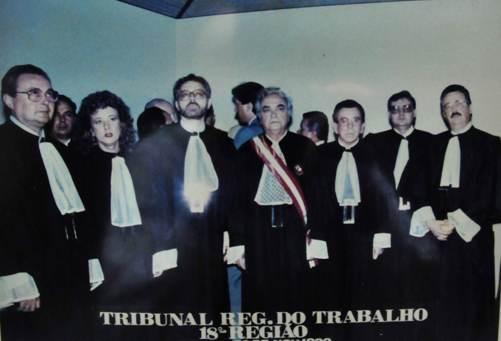 Magistrados integrantes do Tribunal Regional do Trabalho da 18ª Região quando de sua instalação, em novembro de 1990. A partir da esquerda: Dr. Luiz Francisco Guedes de Amorim, Dra. Ialba-Luza Guimarães de Mello, Dr. Octávio José de Magalhães Drummond Maldonado, Dr. Alberto Mendes Rodrigues de Souza, Dr. Sebastião Renato de Paiva, Dr. Platon Teixeira de Azevedo Filho, Dr. Norton Ribeiro Hummel.