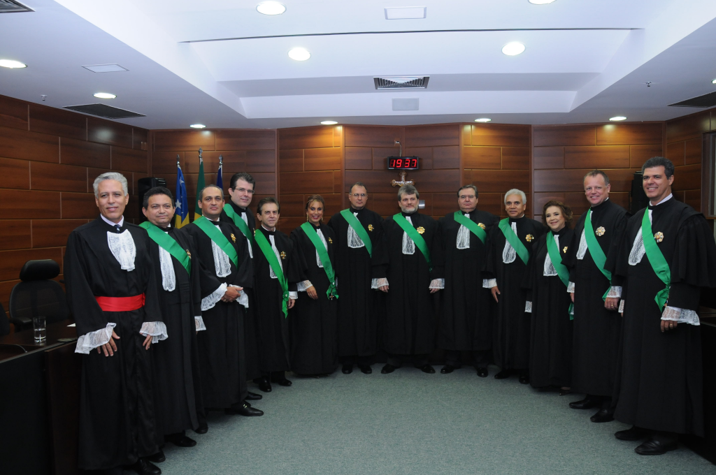 Atual composição do Tribunal Regional do Trabalho da 18ª Região (2011). A partir da esquerda: Dr. Januário Justino Ferreira (Procurador do Trabalho), Desembargador Geraldo Rodrigues do Nascimento, Desembargador Paulo Sérgio Pimenta, Desembargador Aldon do Vale Alves Taglianegna, Desembargador Gentil Pio de Oliveira, Desembargadora Kathia Maria Bomtempo de Albuquerque, Desembargador Júlio César Cardoso de Brito (Vice Presidente), Desembargador Mário Sérgio Bottazzo (Presidente), Desembargador Platon Teixeira de Oliveira Fiho, Desembargador Elvecio Moura dos Santos, Desembargadora Elza Cândida da Silveira, Desembargador Breno Medeiros, Desembargador Daniel Viana Júnior