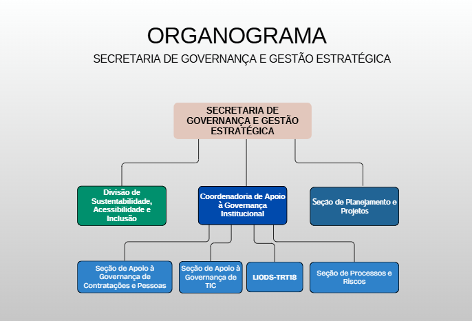 Estão diretamente ligadas à Secretaria de Governança e Gestão Estratégica as seguintes unidades: Divisão de Sustentabilidade, Acessibilidade e Inclusão; Coordenadoria de Apoio à Governança Institucional; e Seção de Planejamento e Projetos, conforme organograma abaixo: