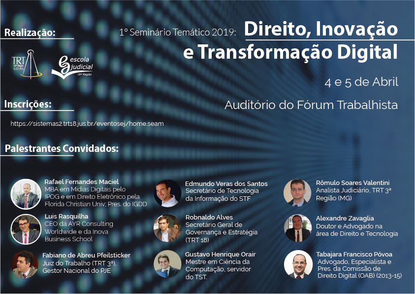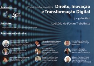 Como dimensionar o impacto das novas tecnologias na vida das pessoas e no ambiente de trabalho? O assunto será abordado no 1º Seminário Temático de 2019 sobre Direito, inovação e transformação digital, que será realizado nos dias 4 e 5 de abril no auditório do Fórum Trabalhista de Goiânia.