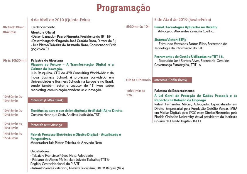 O evento é promovido pela Escola Judicial do TRT da 18ª Região (GO) e é aberto também à comunidade em geral. As inscrições podem ser feitas pelo link: https://sistemas2.trt18.jus.br/eventosej/home.seam