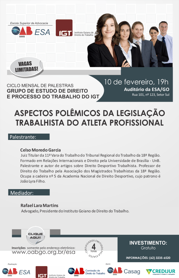 As inscrições são gratuitas e podem ser feitas pelo site www.oabgo.org.br/esa. O participante terá direito a certificado de 4 horas. O juiz Celso Garcia é formado em Relações Internacionais e Direito pela Universidade de Brasília. Ele é professor de Direito do Trabalho pela Amatra18, além de ser palestrante e autor de diversos livros sobre Direito Desportivo Trabalhista.