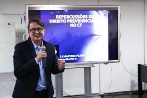O juiz Lamartino França de Oliveira, titular da 3ª Vara do Trabalho de Várzea Grande (TRT23), ministra curso sobre as repercussões do direito previdenciário nos contratos de trabalho a magistrados e servidores do TRT de Goiás, nesta quinta e sexta-feiras (23 e 24/8), na Escola Judicial. O objetivo do curso é trazer esclarecimentos sobre os institutos de grande relevância do Direito Previdenciário que se comunicam com o Direito do Trabalho e o Processo do Trabalho, tais como o financiamento da previdência social, os benefícios previdenciários relacionados ao contrato de trabalho e os reflexos da Reforma Trabalhista (Lei 13.467/2017) na relação previdenciária.