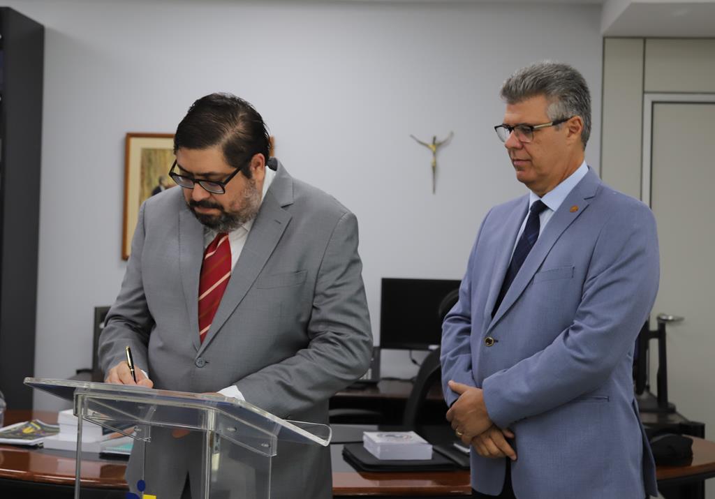 Juiz Fabiano Coelho (à esquerda) assina termo de assunção de titularidade da VT de Goiatuba, para a qual foi removido a pedido