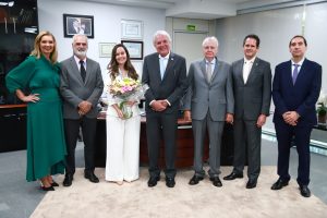 Juíza Priscila Aguiar com o presidente do TRT-GO e familiares. Simone Souza, mãe da magistrada, declarou estar muito feliz com o retorno da filha para Goiás. “É a casa dela, é onde está a base dela, a família, os amigos que ela construiu, toda a trajetória dela, a carreira dentro do tribunal”, disse orgulhosa