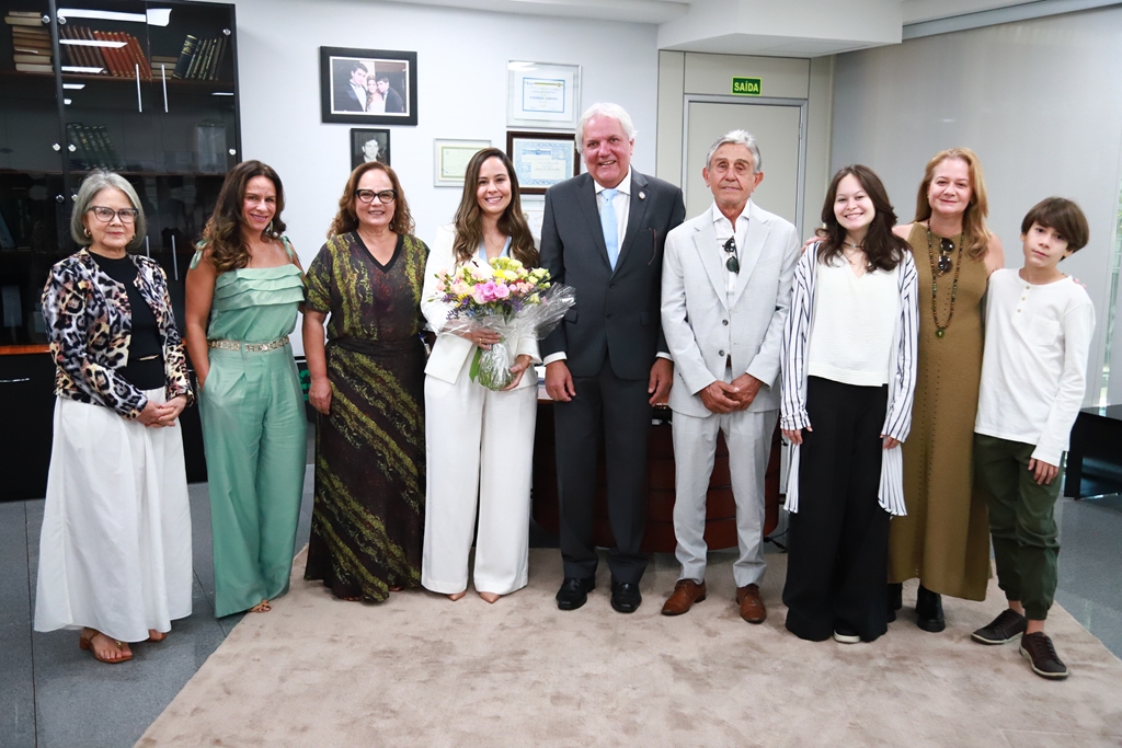 Juíza Priscila Aguiar com o presidente do TRT-GO e familiares. Simone Souza, mãe da magistrada, declarou estar muito feliz com o retorno da filha para Goiás. “É a casa dela, é onde está a base dela, a família, os amigos que ela construiu, toda a trajetória dela, a carreira dentro do tribunal”, disse orgulhosa