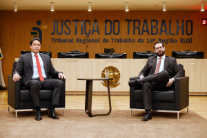 Dois homens de terno estão sentados em poltronas de couro em um palco. Entre eles, uma pequena mesa. Ao fundo, está o logo da "Justiça do Trabalho" e "Tribunal Regional do Trabalho da 18ª Região (GO)".