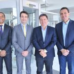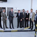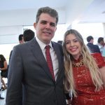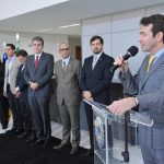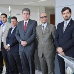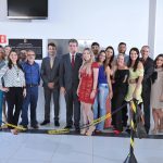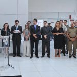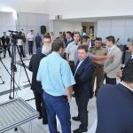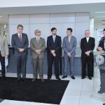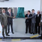 O presidente do TRT, desembargador Aldon Taglialegna, e o prefeito municipal, Chico Bala, fazem o descerramento da placa de inauguração da nova sede do Fórum Trabalhista de Itumbiara. Ao lado, autoridades que compuseram o dispositivo de honra
