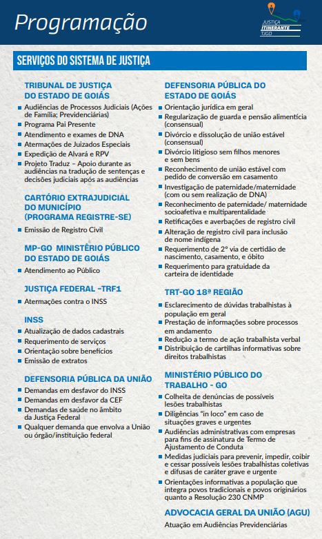 Durante os dois dias de programação, a comunidade terá acesso a audiências judiciais, serviços de documentação, orientação jurídica, exames de DNA, e registros em causas previdenciárias e trabalhistas, além de atos do projeto Pai Presente, que busca o reconhecimento de paternidade.