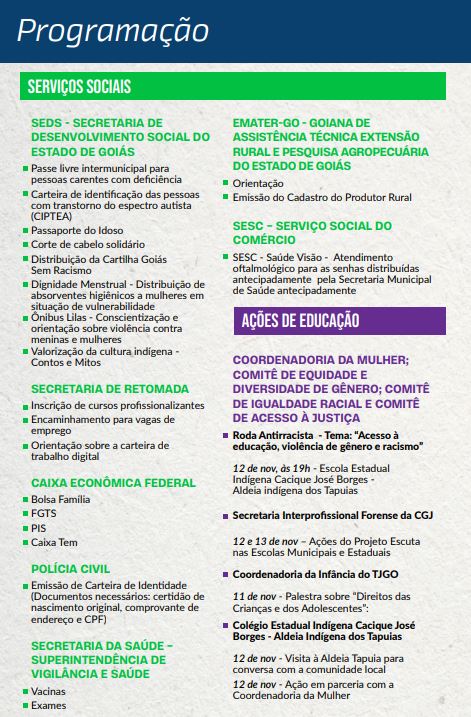 A programação inclui ainda rodas de conversa, debates sobre educação, racismo, violência de gênero, e palestras sobre direitos das crianças e adolescentes. Ações em escolas e visitas à Aldeia Tapuia também estão previstas, fortalecendo o diálogo entre a comunidade e o sistema de justiça.
