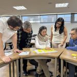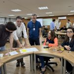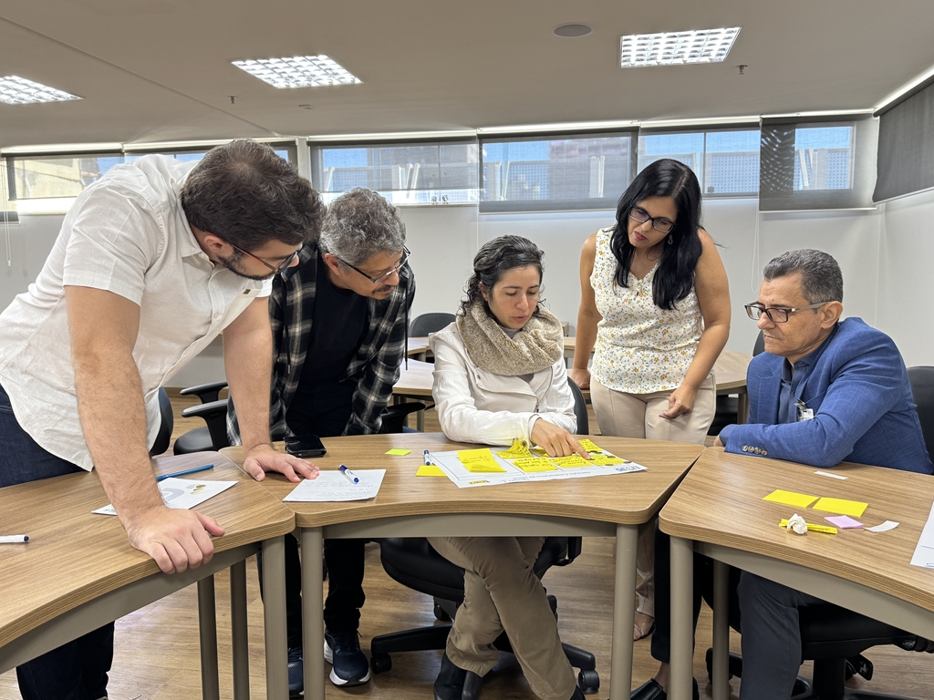 As facilitadoras da oficina utilizaram a técnica do design thinking nas atividades propostas aos participantes. Essa abordagem é centrada nas pessoas para resolução de problemas, focando na criação de soluções inovadoras e eficazes. O design thinking envolve um processo interativo e colaborativo, que busca entender as necessidades do usuário, gerar ideias, prototipar soluções e testá-las.