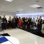 Presentes à solenidade (da esquerda para a direita): o secretário-geral da Presidência, Thiago Domiciano de Almeida, o presidente da Amatra18, juiz Cleber Sales, e os desembargadores Mário Bottazzo, Daniel Viana Júnior e Welington Peixoto, além de servidores e familiares do empossado