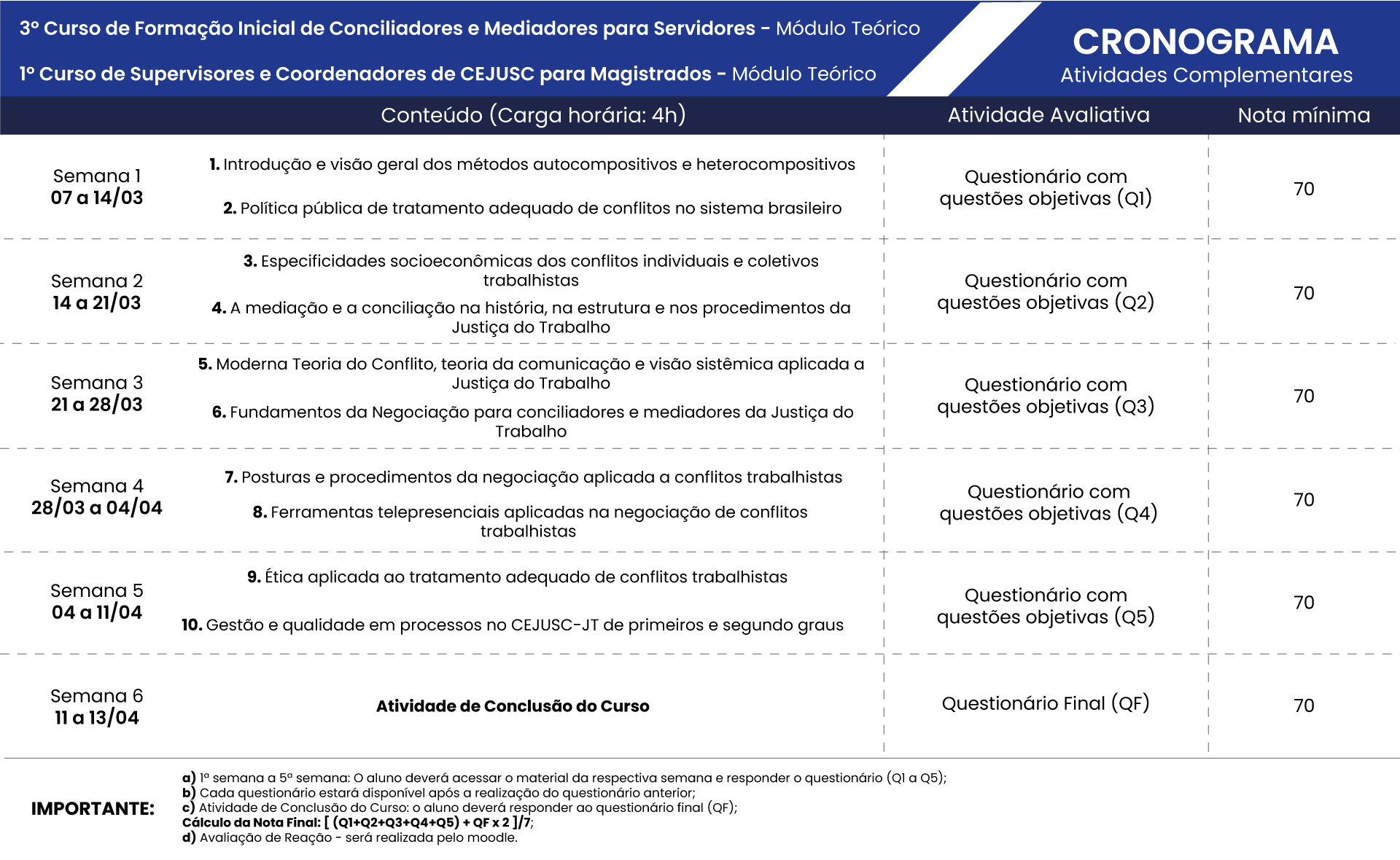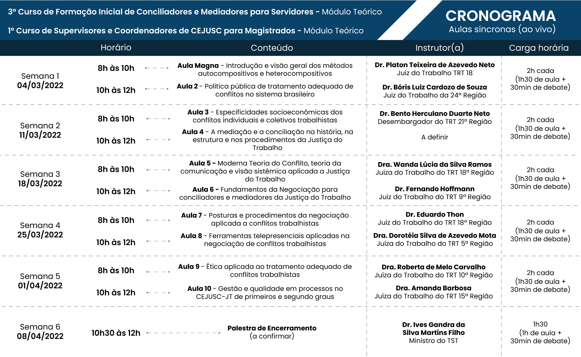 A parte prática do curso terá duração de 60 horas e acontecerá no período de 2 de maio a 30 de junho. Ao final das duas etapas, o curso totalizará 100 horas, conforme a Resolução CSJT 174/2016, que dispõe sobre a política judiciária de tratamento adequado das disputas de interesses no Poder Judiciário Trabalhista.