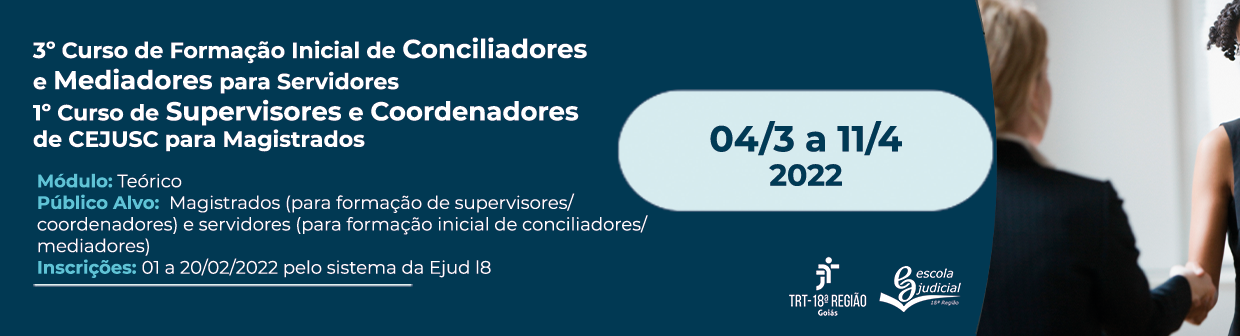 A Escola Judicial do TRT-18 (Ejud18) promove a “3ª turma do curso de Formação de Conciliadores/Mediadores e a 1ª turma do curso de Supervisores e Coordenadores de CEJUSC” entre os dias 4 de março a 11 de abril de 2022. Para magistrados, o objetivo do treinamento é formar supervisores e coordenadores para atuar nos Centros Judiciários de Métodos Consensuais de Solução de Disputas (Cejusc) do Estado e, para os servidores, o objetivo é formar conciliadores e mediadores. As inscrições devem ser feitas de 1º a 20 de fevereiro pelo sistema de cursos da Ejud18.