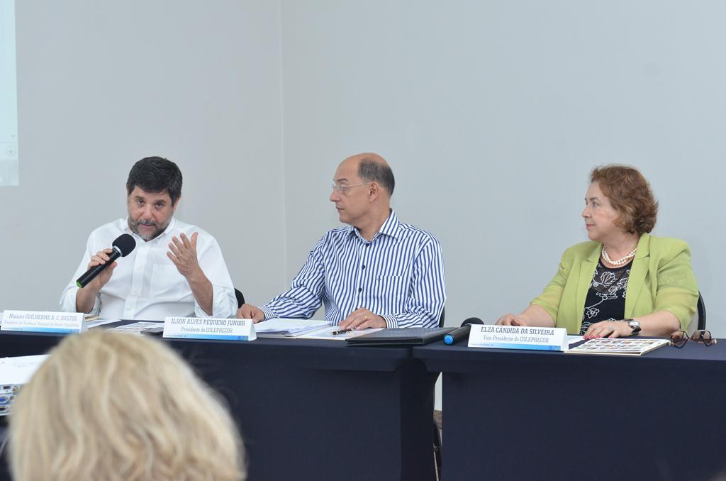 O ministro Caputo Bastos ao lado do presidente e da vice-presidente da entidade, respectivamente, desembargador Ilson Alves Pequeno Junior (presidente e corregedor do TRT 14ª Região/RO/AC) e desembargadora Elza Silveira (presidente do TRT da 18ª Região/GO).