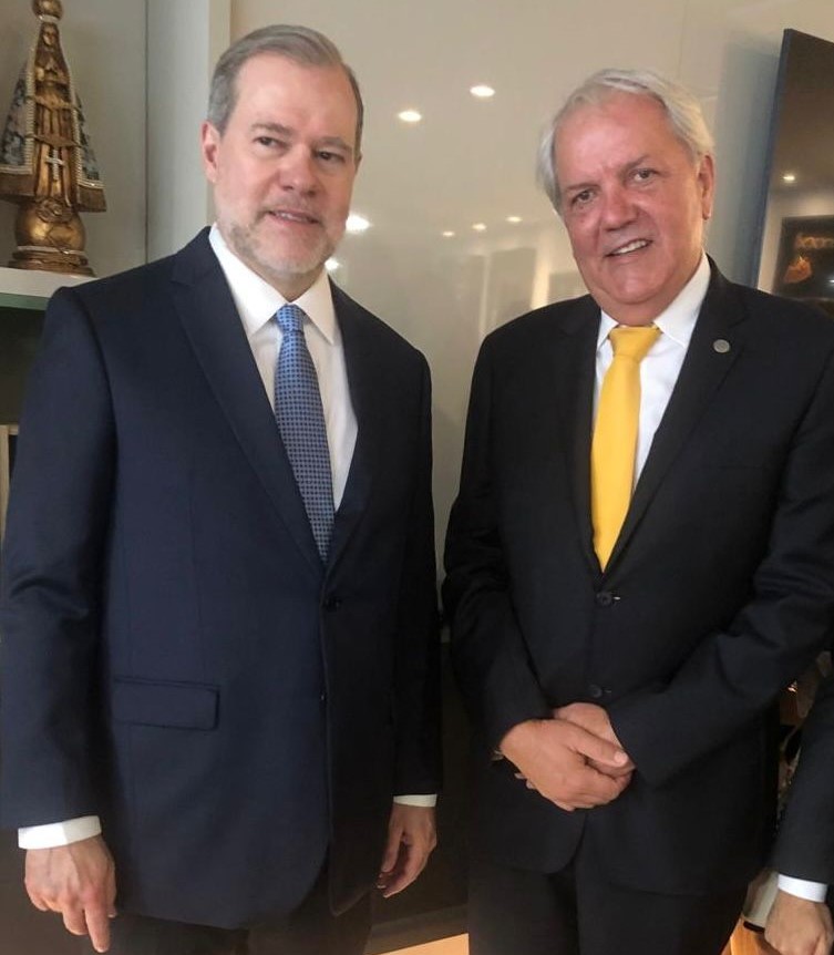 Ministro Dias Toffoli e o desembargador Eugênio Cesário em encontro na Assembleia Legislativa de Goiás na manhã de sexta-feira (13/6). O presidente do TRT-GO prestigiou a solenidade de entrega do título de cidadania goiana aos ministros Toffoli e Gilmar Mendes (STF) e ao procurador-geral da República, Paulo Gonet