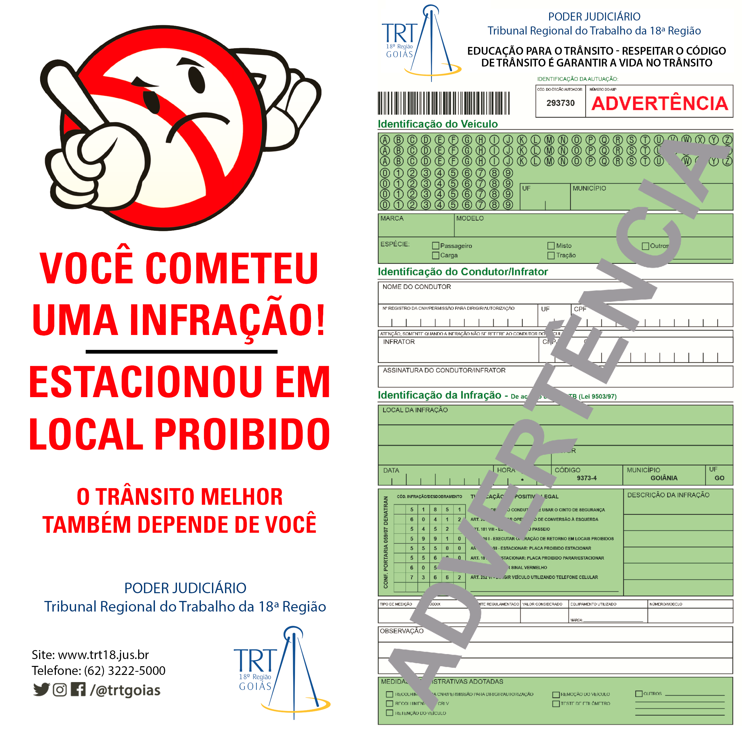 O Tribunal Regional do Trabalho da 18ª Região (Goiás) passou a aplicar, a partir desta quinta-feira (18/10), uma multa social aos motoristas que desrespeitarem as vagas especiais reservadas a idosos, gestantes e bombeiros no entorno dos prédios do Complexo Trabalhista de Goiânia, no Setor Bueno. O infrator receberá um folheto similar a uma notificação real, mas que terá caráter exclusivamente pedagógico. O objetivo é conscientizar servidores e o público em geral acerca da importância de se respeitar esses espaços garantidos por lei a pessoas que deles necessitam.