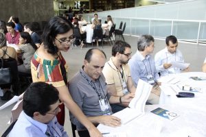 Após a palestra, os participantes foram divididos em grupos, obedecendo às cores de lápis recebidos no início do evento. Nessa primeira dinâmica de grupo, que misturou pessoas de varas diferentes, os servidores puderam conhecer colegas de outras unidades e trocar experiências sobre o trabalho. Depois, novos grupos foram formados, reunindo apenas servidores de mesma lotação para a construção de um plano de ação da respectiva unidade. Servidores da equipe de apoio da SGE auxiliaram na atividade.