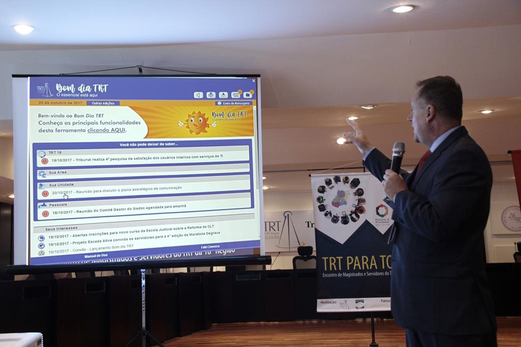 Em seguida, Breno Medeiros lançou o “Bom dia TRT”. A ferramenta de comunicação com o público interno reúne, em uma mesma janela aberta na área de trabalho dos computadores, as informações essenciais para o servidor ter conhecimento do que está acontecendo no Tribunal, nas áreas e unidades específicas. Leia mais sobre isso aqui.