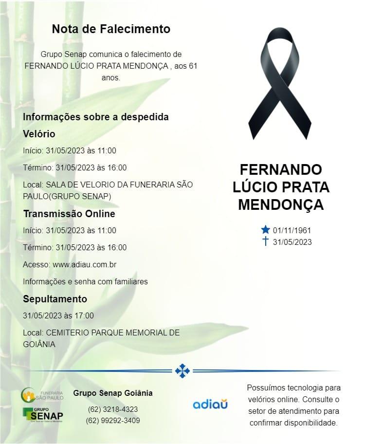 A administração do TRT de Goiás manifesta profundo pesar pelo falecimento do servidor Fernando Lúcio Prata Mendonça, aos 61 anos. O velório ocorrerá na sala de velório da Funerária São Paulo (Grupo Senap), em Goiânia, a partir das 11h e vai até as 16h. O sepultamento será no cemitério Parque Memorial de Goiânia às 17h.
