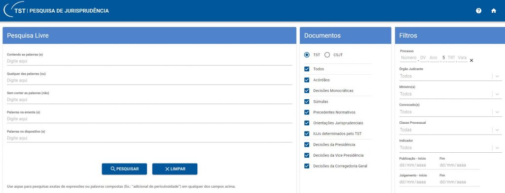 Na nova página de Jurisprudência do TST, a busca pode ser realizada de forma simultânea nas três colunas existentes na página inicial da busca. A primeira, à esquerda, é de pesquisa livre, a partir de palavras ou frases; a do meio permite a escolha por documentos (acórdãos, ementas e súmulas); e a terceira, à direita, traz filtros como órgão judicante, relator, datas, etc.