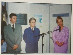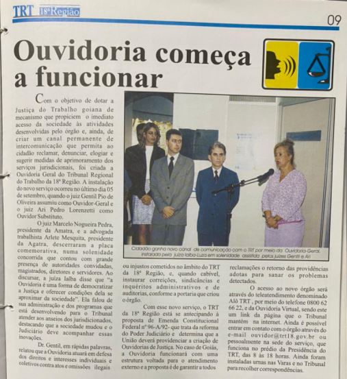 Notícia veiculada à época no jornal Informativo TRT Goiás. A Ouvidoria foi criada em 7 de julho de 2000 e a inauguração da sala de atendimento ocorreu em 5 de setembro. À esquerda da foto a advogada Arlete Mesquita, à época presidente da Associação dos Advogados Trabalhistas do Estado de Goiás (Agatra).