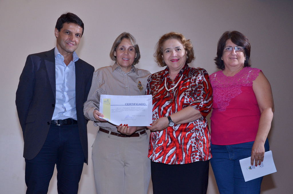 Presidente do Setransp, Décio Caetano, a palestrante, Simone Lemos, presidente do TRT, desembargadora Elza Silveira, e a diretora do SEST/SENAT, Joabeth Costa, durante entrega de certificado