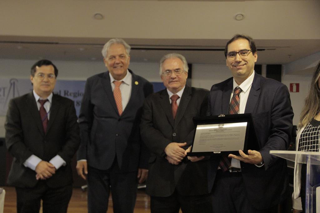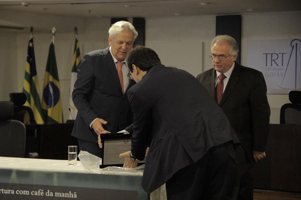 Após a palestra, o diretor e a equipe da EJUD-18 prestaram uma homenagem ao juiz do trabalho Platon Neto, entregando-lhe uma placa.