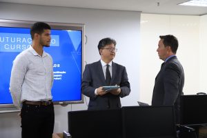 Juiz Rodrigo Trindade (à direita) com o servidor Marcelo Souza (à esquerda) e o juiz Kleber Waki, coordenador pedagógico da Ejud (ao centro)