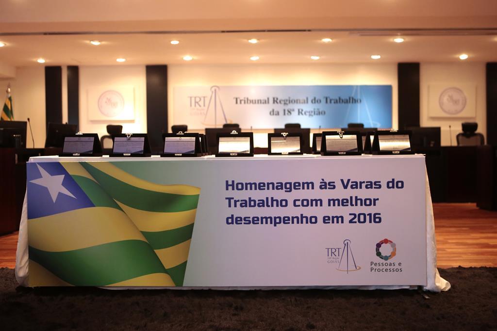 Em solenidade realizada no auditório do Fórum Trabalhista de Goiânia na última sexta-feira (31/3), o presidente do Tribunal Regional do Trabalho de Goiás (TRT-GO), desembargador Breno Medeiros, e o vice-presidente e corregedor do Tribunal, desembargador Paulo Pimenta, homenagearam as Varas do Trabalho da 18ª Região que contribuíram para o aumento da produtividade do primeiro grau em 2016. Foram entregues placas e certificados a 34 unidades judiciárias, sendo 9 da capital e 25 do interior, as quais tiveram os melhores desempenhos nas fases de conhecimento e de execução.