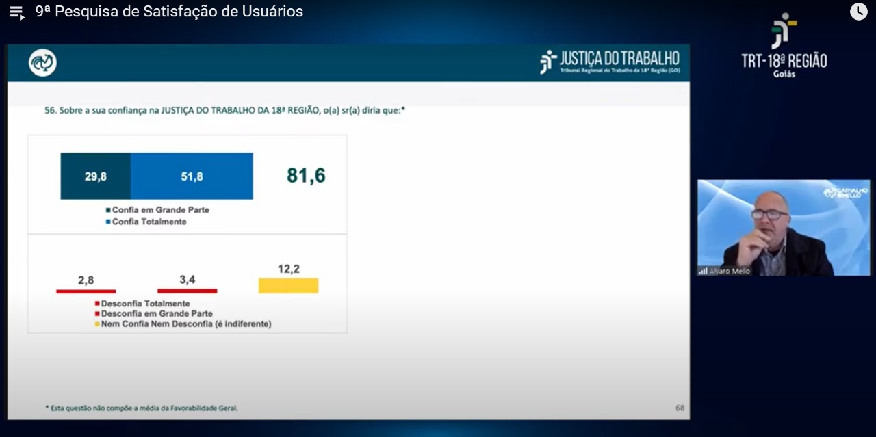 O percentual de confiança do usuário na Justiça do Trabalho goiana é de 81,6%, aponta o resultado da 9ª Pesquisa de Satisfação dos Usuários Externos realizada pela consultoria Carvalho e Mello. O levantamento também revelou índice de favorabilidade geral de 79,4%. Os resultados foram apresentados pelo diretor da empresa, Álvaro Mello, à Administração do TRT-18 na tarde da última quinta-feira (1º/7) por meio de videoconferência pela plataforma Zoom.