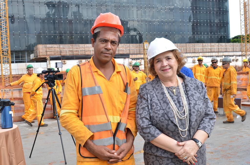 Presidente do TRT com Renato José, um dos trabalhadores da obra, que entrevistou a presidente sobre a obra para um vídeo que ele mesmo está produzindo.