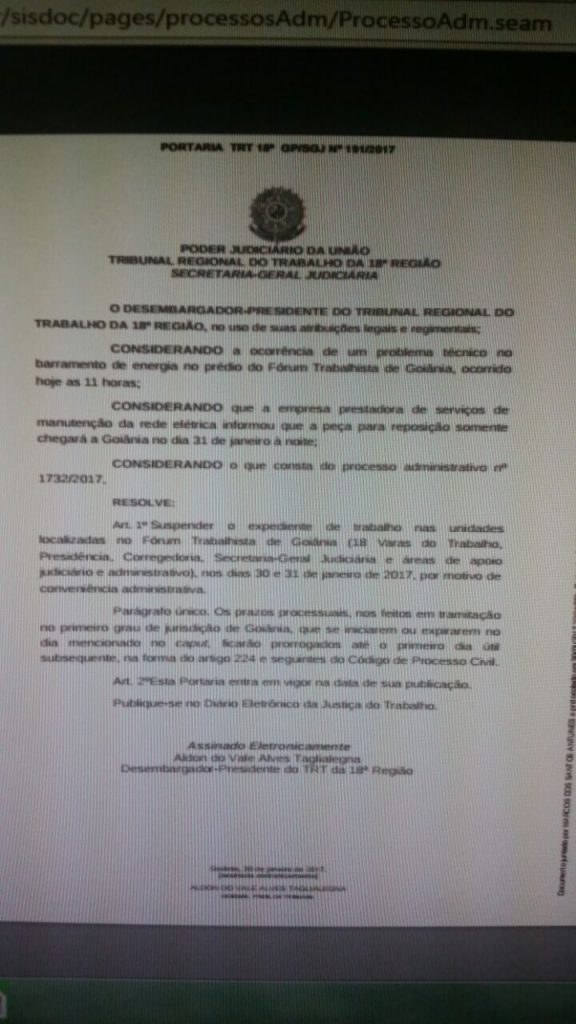 A queda de energia que atingiu boa parte dos bairros da capital afetou o sistema de energia do Fórum Trabalhista de Goiânia. Mais uma vez o barramento, equipamento que faz a distribuição de energia para todas as unidades instaladas no prédio, foi danificado e a previsão é que o reparo seja feito amanhã à noite com a chegada da peça de reposição que vem de São Paulo.