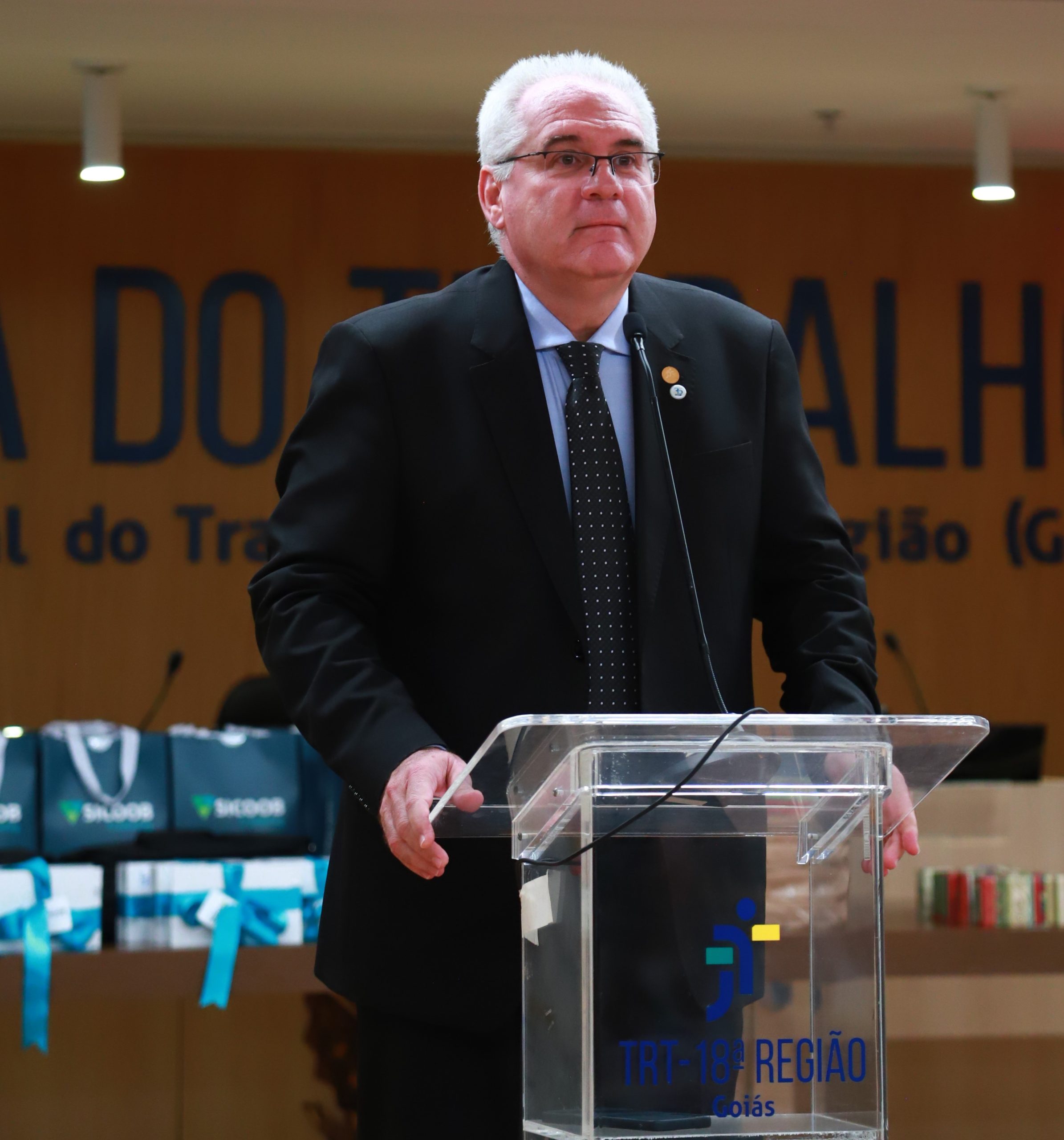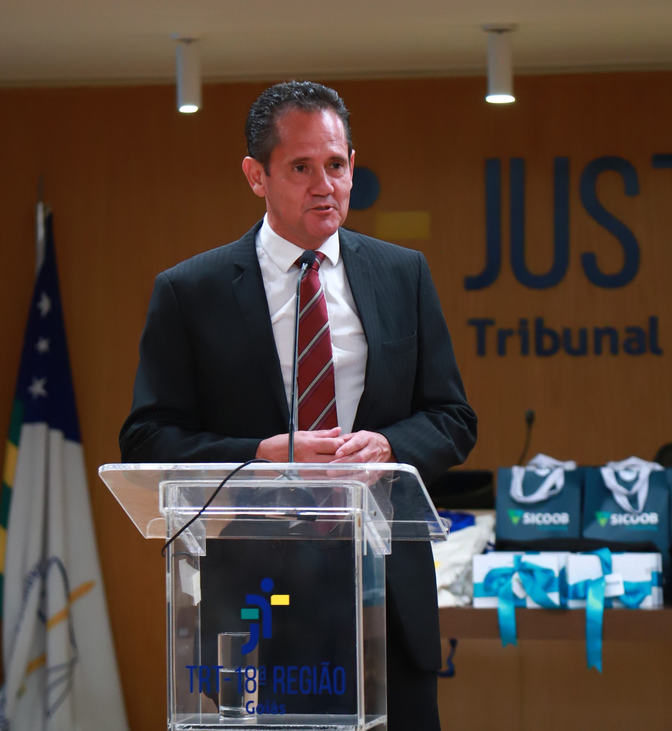 Homem fala ao microfone em um púlpito do TRT da 18ª Região, usando terno escuro e gravata.