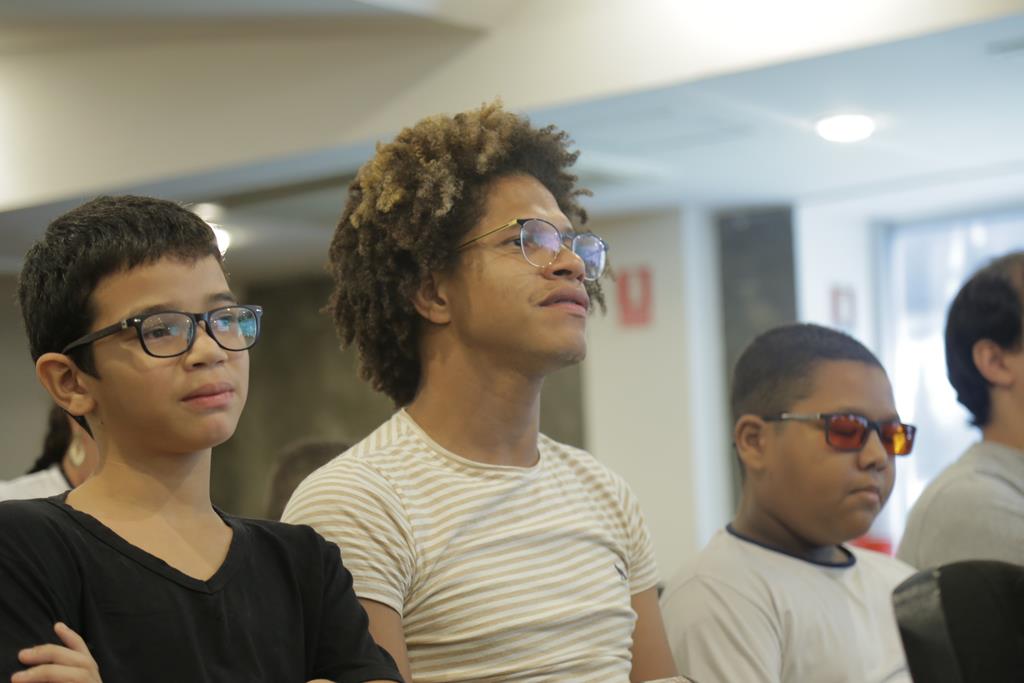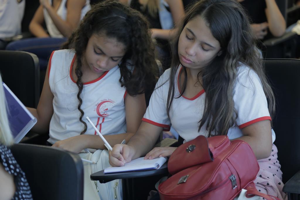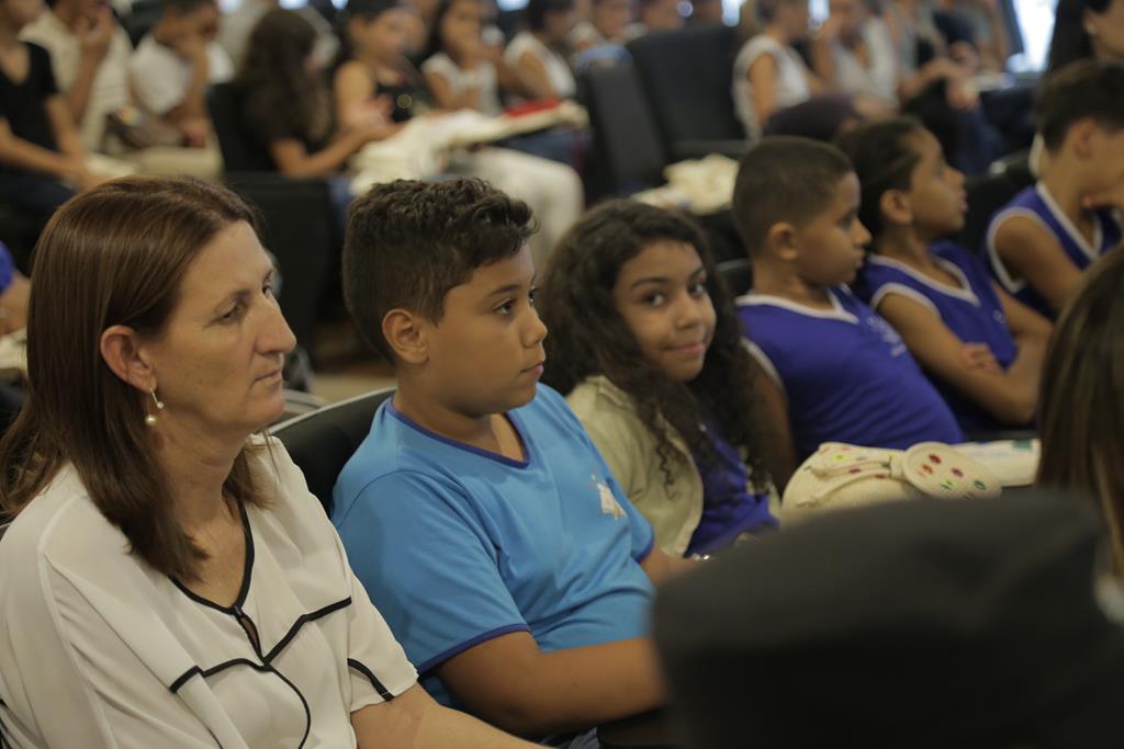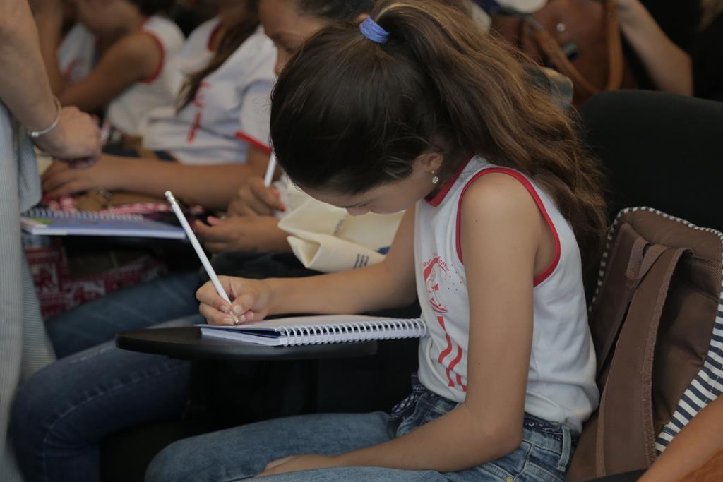 A psicóloga Marina Cançado também falou com os estudantes sobre profissões e a cultura da paz. Ela ressaltou a importância de os jovens exercitarem a empatia e deixarem as redes sociais um pouco. Ao perguntar para a plateia o significado da palavra, Marina se surpreendeu com a rápida e precisa resposta das crianças que já tinham estudado o tema. “Se colocar no lugar do outro”, responderam em coro.