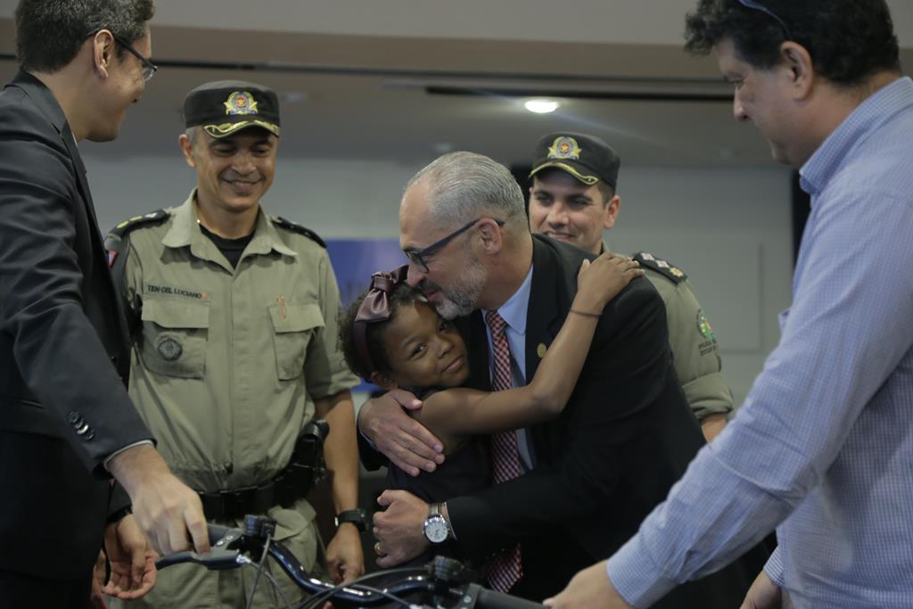 A estudante Iskaylane Silva com o presidente Paulo Pimenta, após ganhar de presente uma bicicleta doada pela PM