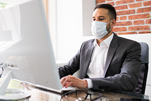 Homem de terno usando máscara contra covid sentado em frente ao computador