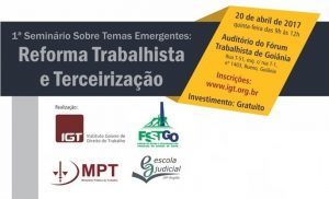 Em parceria com a Escola Judicial do TRT de Goiás, o Ministério Público do Trabalho (MPT) e o Fórum de Saúde e Segurança no Trabalho do Estado de Goiás, o Instituto Goiano de Direito do Trabalho (IGT) realiza amanhã (20/4) o 1º Seminário sobre temas emergentes, que vai discutir a reforma trabalhista e a terceirização. O evento acontece no auditório do Fórum Trabalhista de Goiânia das 9h às 12h e será aberto a advogados, magistrados, servidores, procuradores e estudantes de direito. As inscrições são gratuitas e podem ser feitas no local do evento, caso ainda haja vaga.