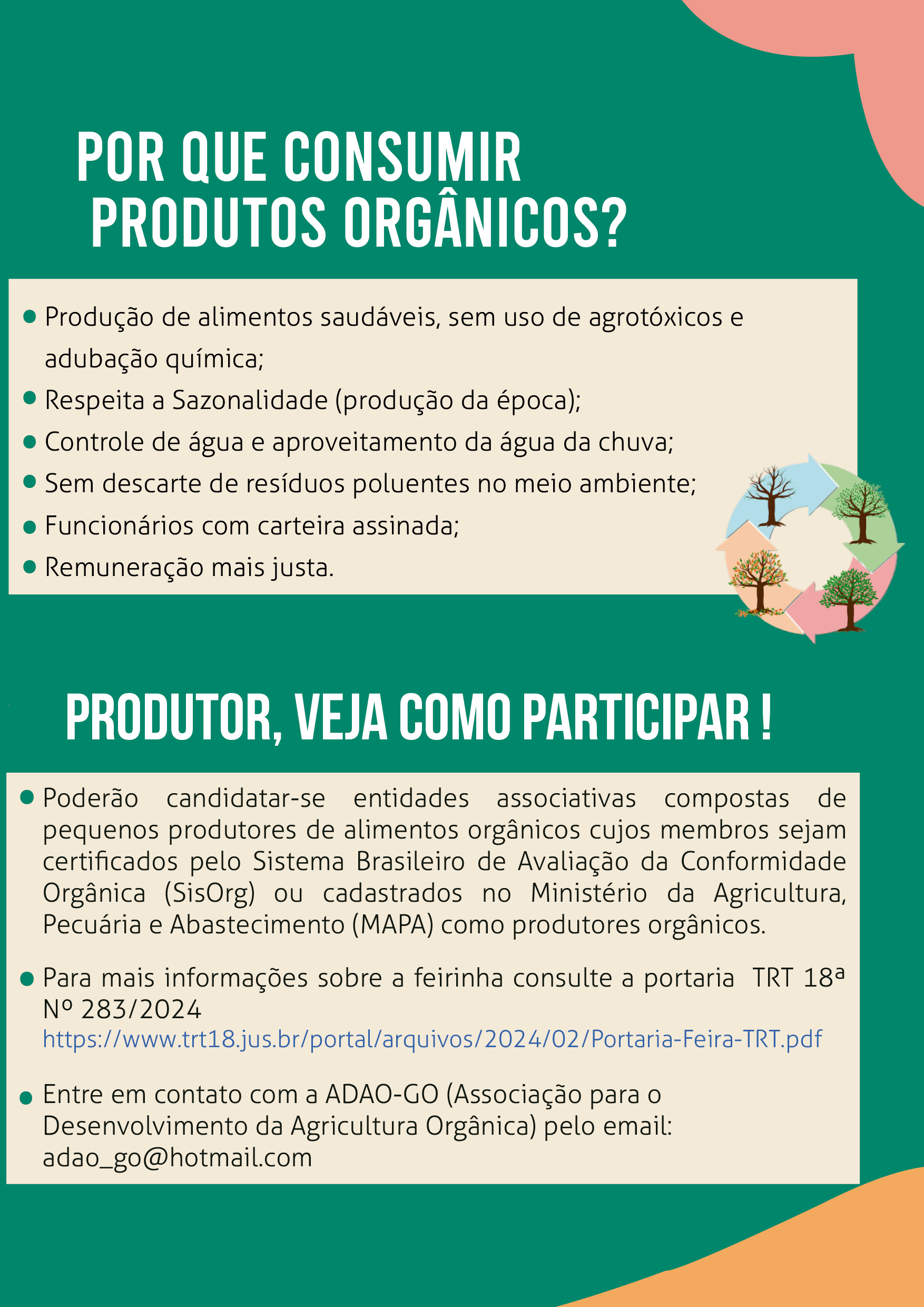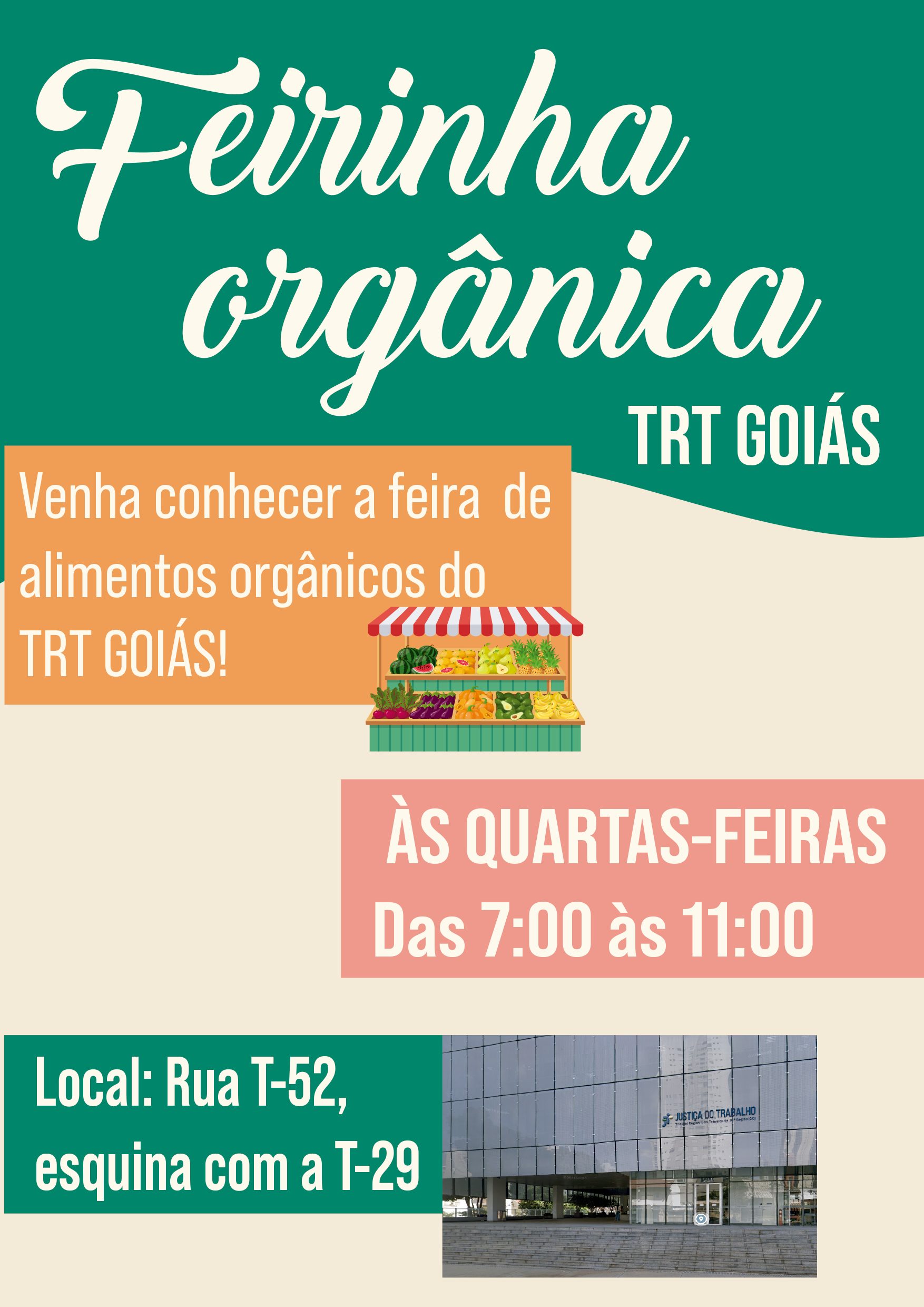 O Tribunal Regional do Trabalho da 18° Região (TRT-GO) realiza, há vários anos, uma Feirinha Orgânica semanalmente. Se você ainda não conhece a feira, não perca a oportunidade de visitá-la e comprar alimentos mais saudáveis. A feira regulamentada pela portaria Nº 283/2024, acontece todas as quartas-feiras, das 7h às 11h, no térreo do novo prédio do TRT-GO, localizado na rua T-52 (esquina com a T-29). A feirinha é aberta ao público.