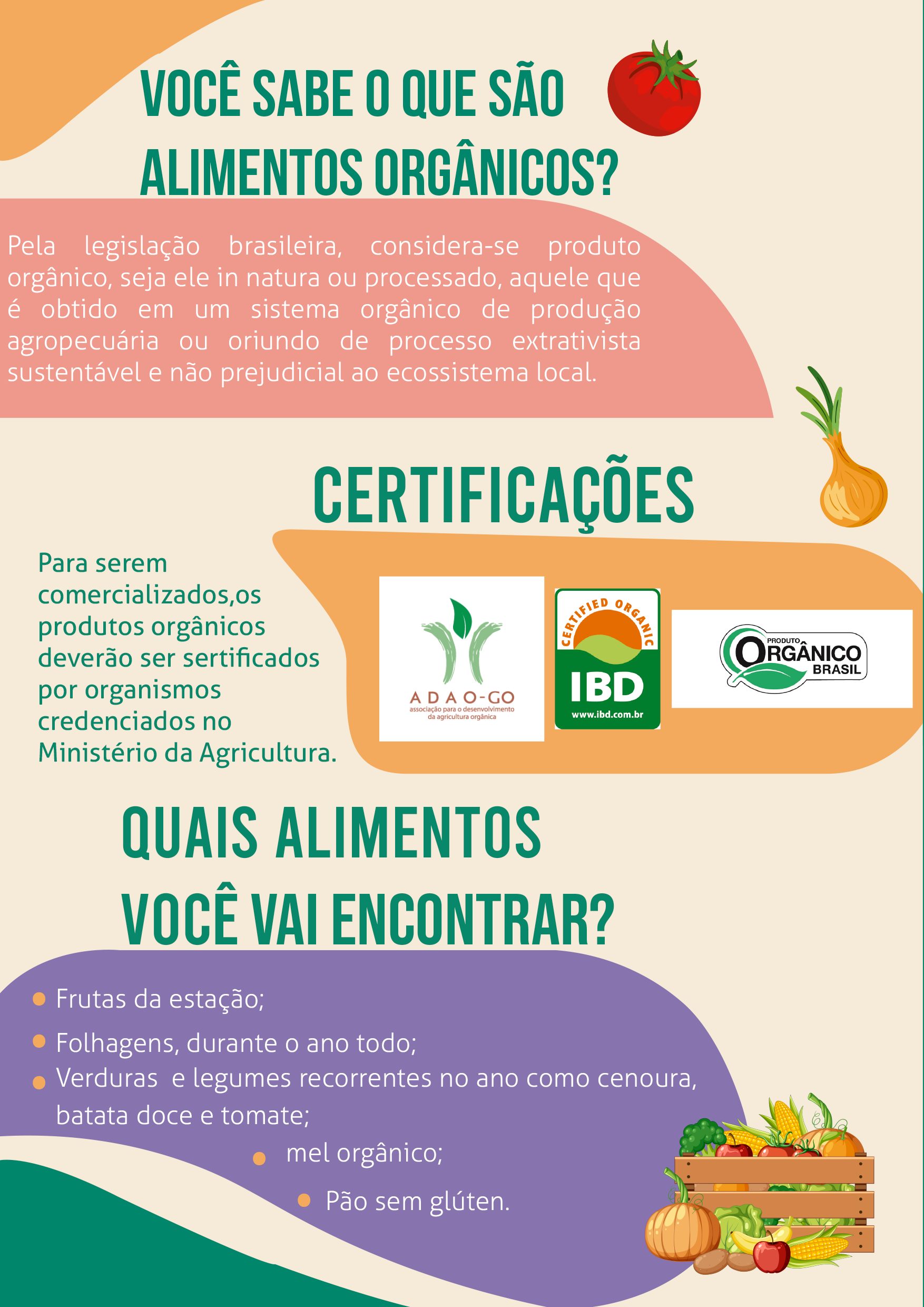 A Semana dos Alimentos Orgânicos faz parte da Campanha Anual de Promoção do Produto Orgânico, promovida pelo Mapa em todo o Brasil, com diversas atividades como feiras, palestras, workshops e degustações de produtos orgânicos. Você pode encontrar informações sobre os eventos em seu Estado no site do Ministério da Agricultura e Pecuária.