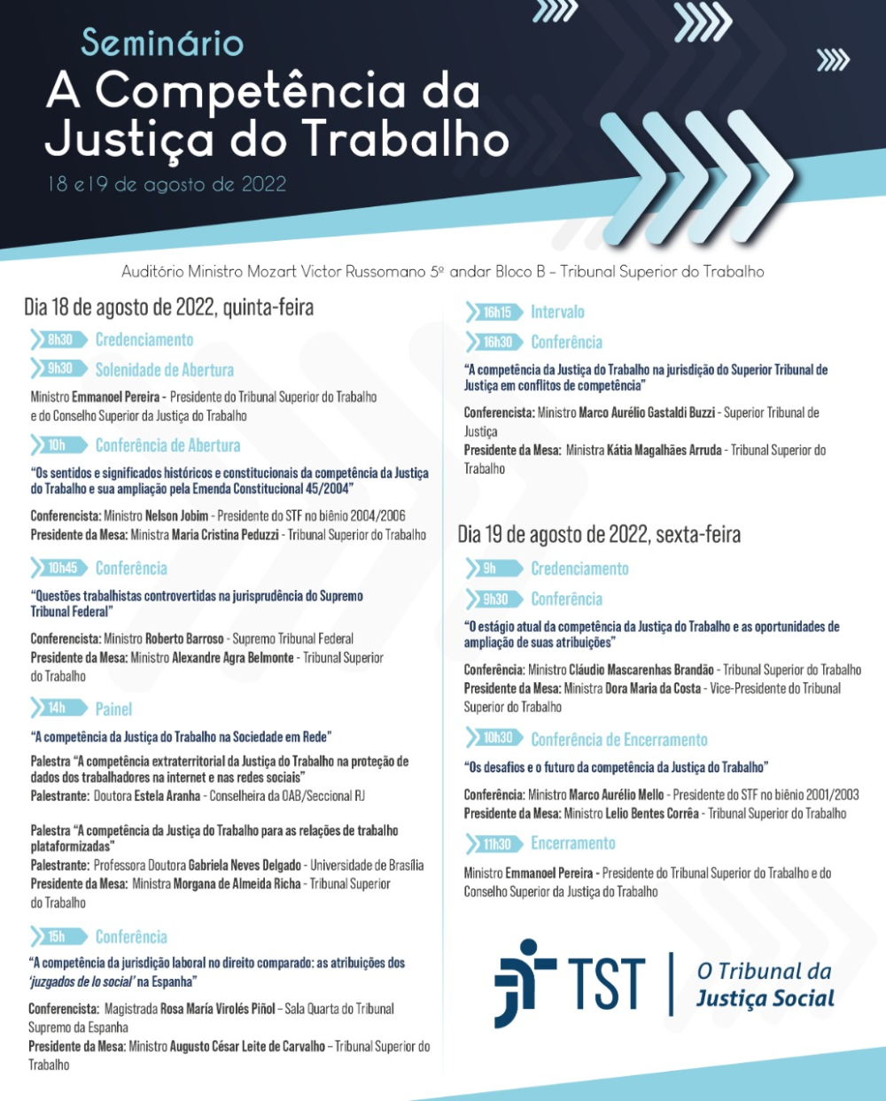 O Seminário Internacional “A Competência da Justiça do Trabalho” será realizado no Auditório Ministro Mozart Victor Russomano, no 5º andar do Bloco B do edifício-sede do TST, em Brasília. Faça a sua inscrição aqui.