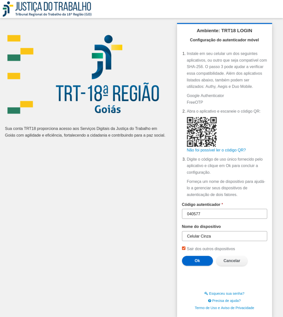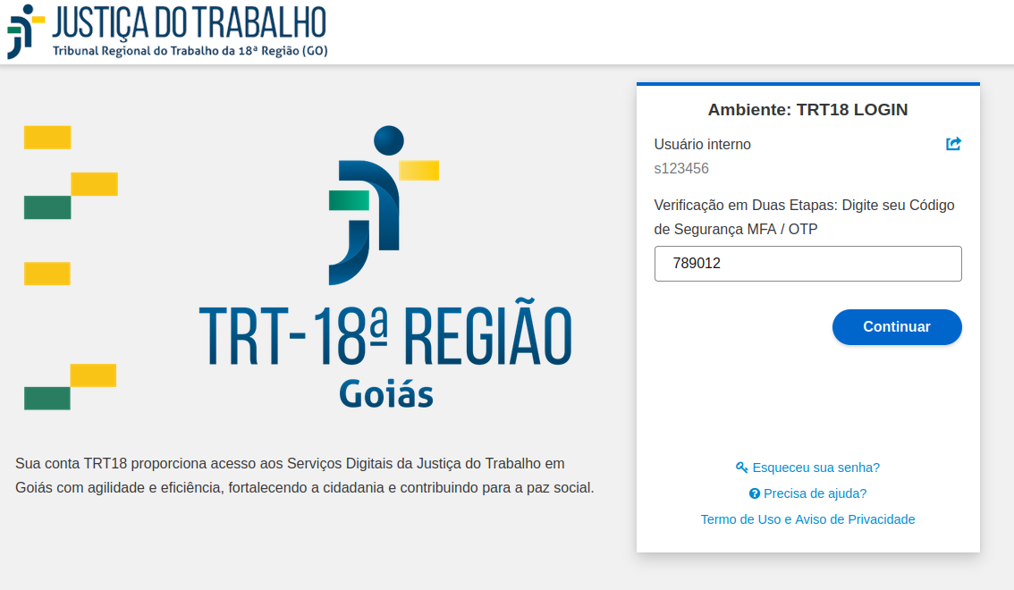 Pronto! Dessa forma, o usuário poderá realizar sua autenticação de maneira mais segura nos sistemas sensíveis do Tribunal. A adoção do método de múltiplo fator de autenticação (MFA/OTP) garantirá uma proteção adicional contra acessos não autorizados, reforçando a segurança e a integridade dos dados do TRT-GO.