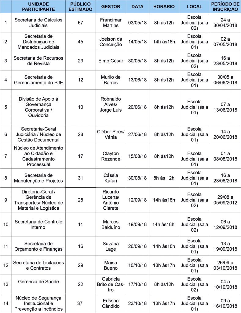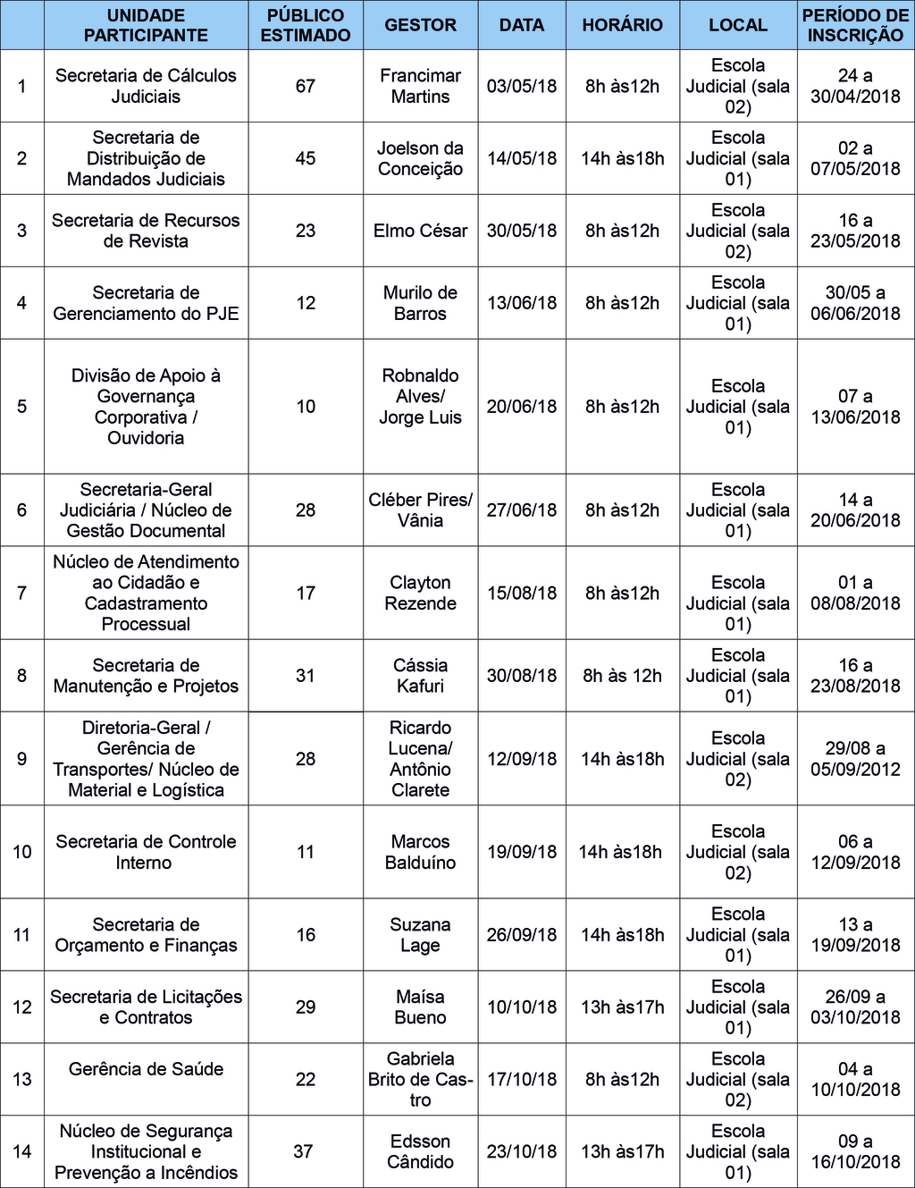 As inscrições para a primeira edição já estão abertas e podem ser feitas por meio de link disponibilizado na aba da Escola Judicial na intranet do TRT18. Fique atento! Observe acima quais são as unidades participantes e a data-limite de inscrição de cada edição. Vale lembrar que estagiários também podem se inscrever.