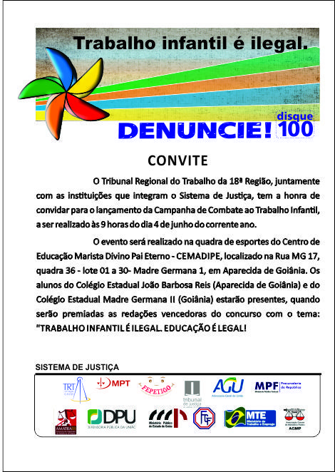 O Tribunal Regional do Trabalho de Goiás, juntamente com outras instituições que integram o Sistema de Justiça de nosso Estado, irá lançar a campanha de combate ao Trabalho Infantil.  Participe!