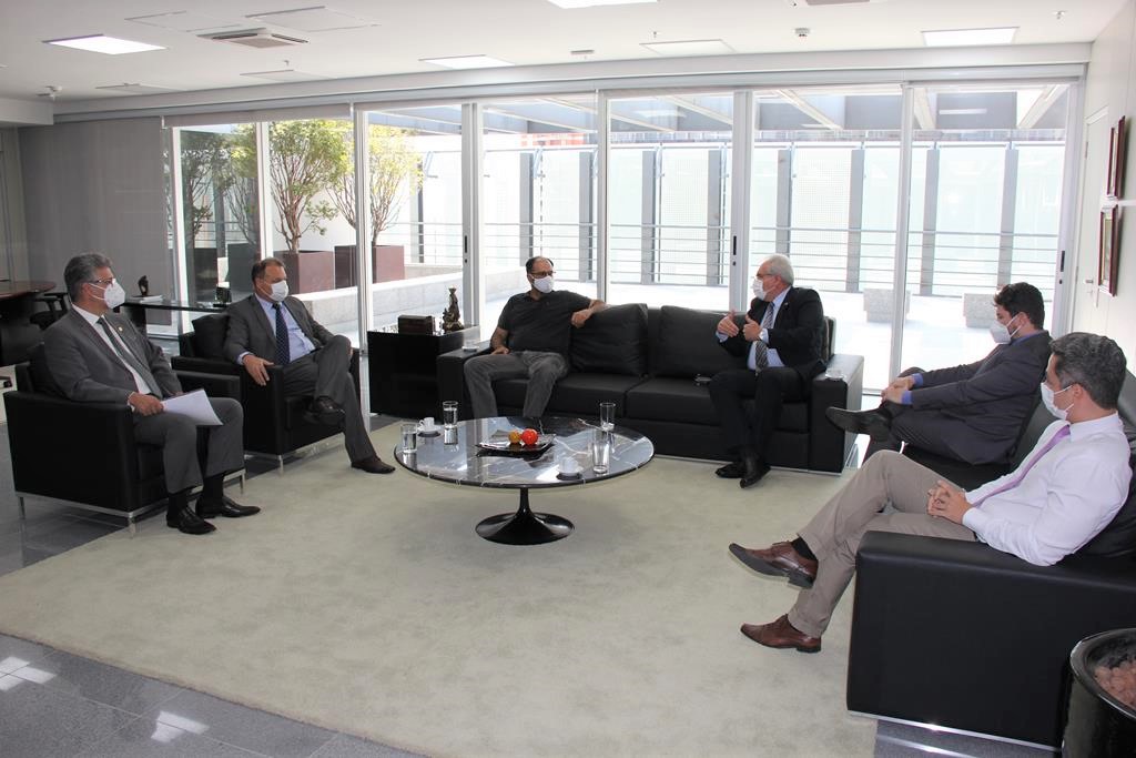 Na reunião, o desembargador Daniel Viana e o juiz Altair Guerra, do TJ-GO, estiveram acompanhados pelo desembargador Welington Peixoto; secretário-geral judiciário Cleber Pires; secretário-geral da presidência Gustavo Seixas; e o diretor da STI Murilo Barros, todos do TRT-18