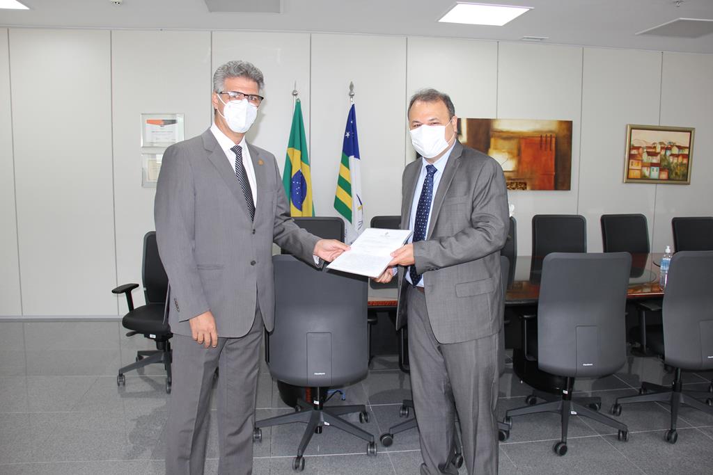 Presidente do TRT-18, desembargador Daniel Viana Júnior (à esquerda) recebe a proposta do termo de cooperação técnica do juiz auxiliar da Corregedoria do TJ-GO, Altair Guerra (à direita)
