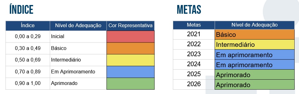 Além do nível aprimorado, existem outros quatro níveis de classificação: “Inicial” (0,00 a 0,29); “Básico” (0,30 a 0,49 – Meta 2021); “Intermediário” (0,50 a 0,69 – Meta 2022); “Em aprimoramento” (0,70 a 0,89 – Meta 2023/24); e “Aprimorado” (0,90 a 1,00 – Meta 2025/26).