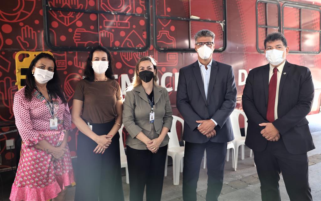 Da esquerda para a direita: Mabel Chediak, Álvaro Resende (diretor-geral do TRT-18), Márcia de Souza, Juliana Guimarães, Patrícia Vieira e o desembargador-presidente do TRT-18, Daniel Viana Júnior, que foi ao local da doação cumprimentar os servidores e doadores e elogiar a iniciativa